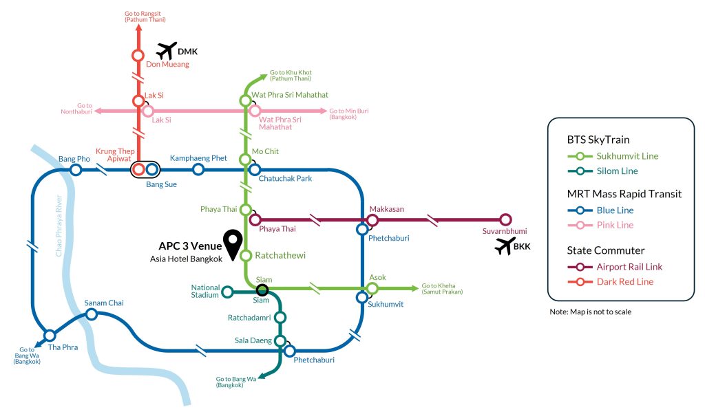 The APC3 will be held at the Asia Hotel Bangkok (https://www.asiahotel.co.th/asia_bangkok/), which is located in the central area of Bangkok. It is conveniently located with direct access to the BTS Skytrain “Ratchathewi” station, facilitating easy travel and access to popular attractions, such as famous landmarks, shopping centers, historical temples and picturesque neighbourhoods. It just 7–8 minutes’ walk to SIAM area shopping hub with popular malls, and just 200m away from vivid night markets, street food stalls and convenience stores.